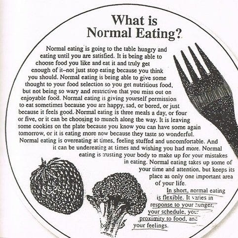 Changing this thinking takes vigilance, especially in a culture that reinforces it. So to keep from falling back into extreme behaviors, I try to surround myself with people less swayed by diet culture, the kind Ellyn Satter would call “normal eaters.” I first encountered the term at 22, during treatment, when the dietitian handed me a printout (below).