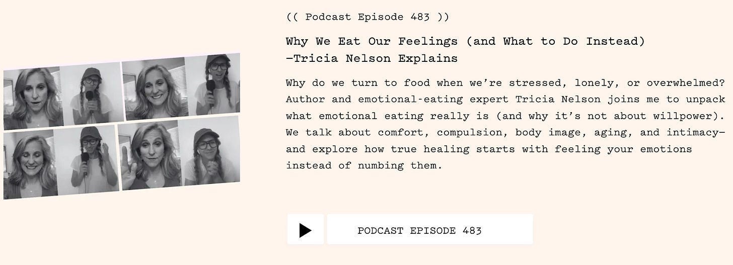We all have things we use to take the edge off and unfortunately, my preferred addiction is the most uncool of all. On this week’s episode with emotional eating expert Tricia Nelson, I lament that getting sober from alcohol not only is cooler, it’s possible to quit completely. Mine isn’t. As Tricia puts it, it’s like having to take a tiger out of its cage, pet it, and get it back in there, without getting bitten.